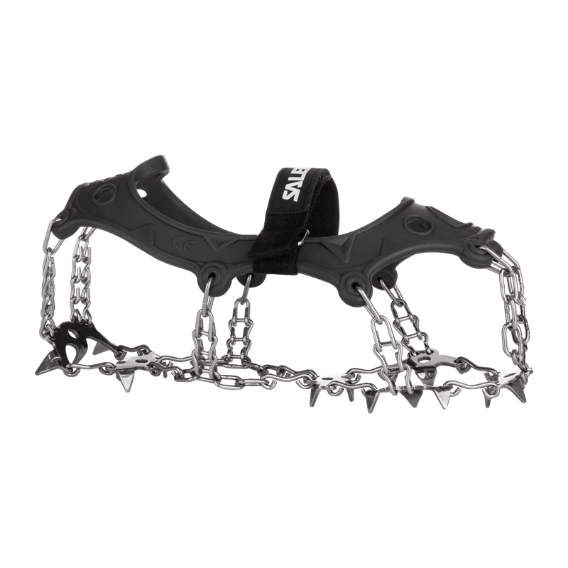 Crampón con puntas de acero inoxidable robustas para una agarre seguro sobre senderos cubiertos por hielo, nieve compacta. Para speed hiking en otroño e invierno, sobre hielo o terreno helado y mixto.