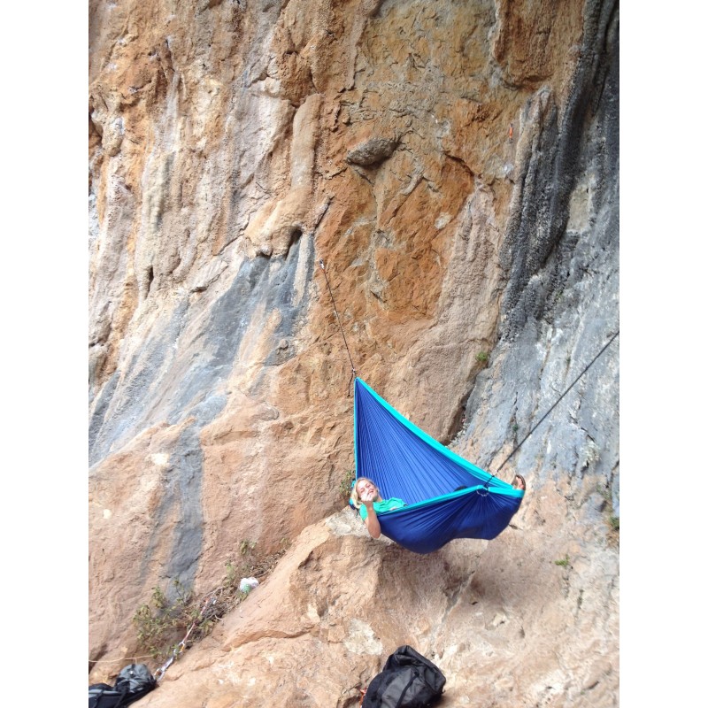 Una hamaca increíblemente ligera sin perder el confort durante el descanso, incluso para personas altas. Gracias al uso de "Dyneema Core" en las cuerdas, se reduce aún más el peso y el volumen.