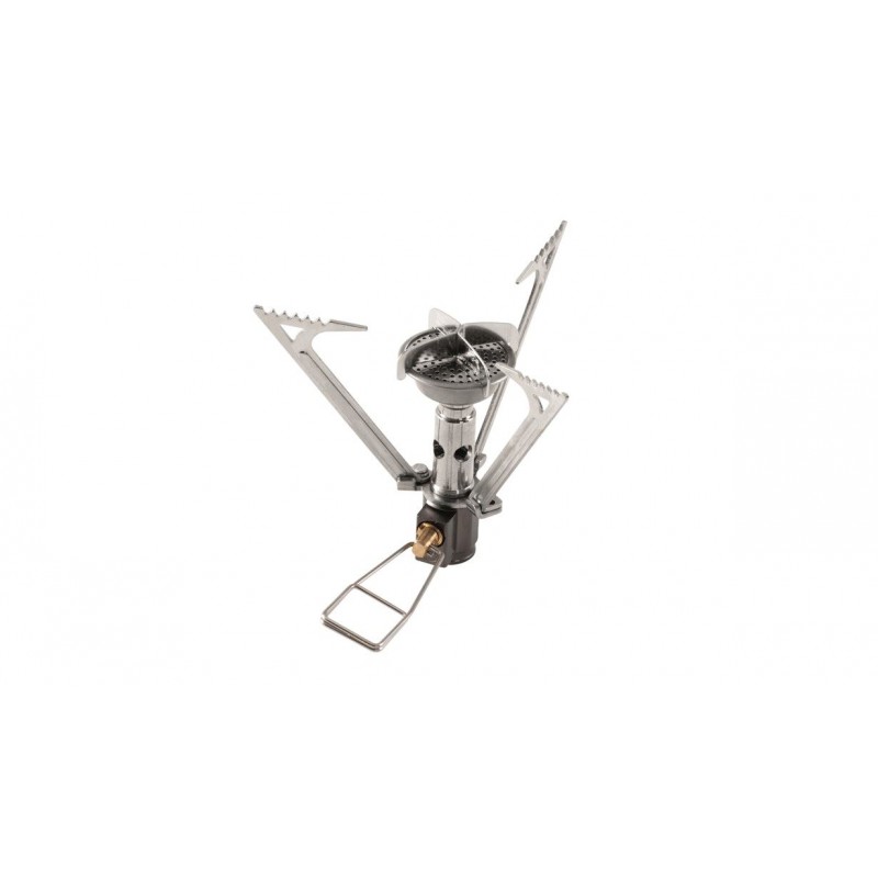 Ligero y compacto. Se acopla directamente al cartucho de gas. El cartucho sirve como base del hornillo. Soporte de olla abatible. Bolsa de transporte incluida.