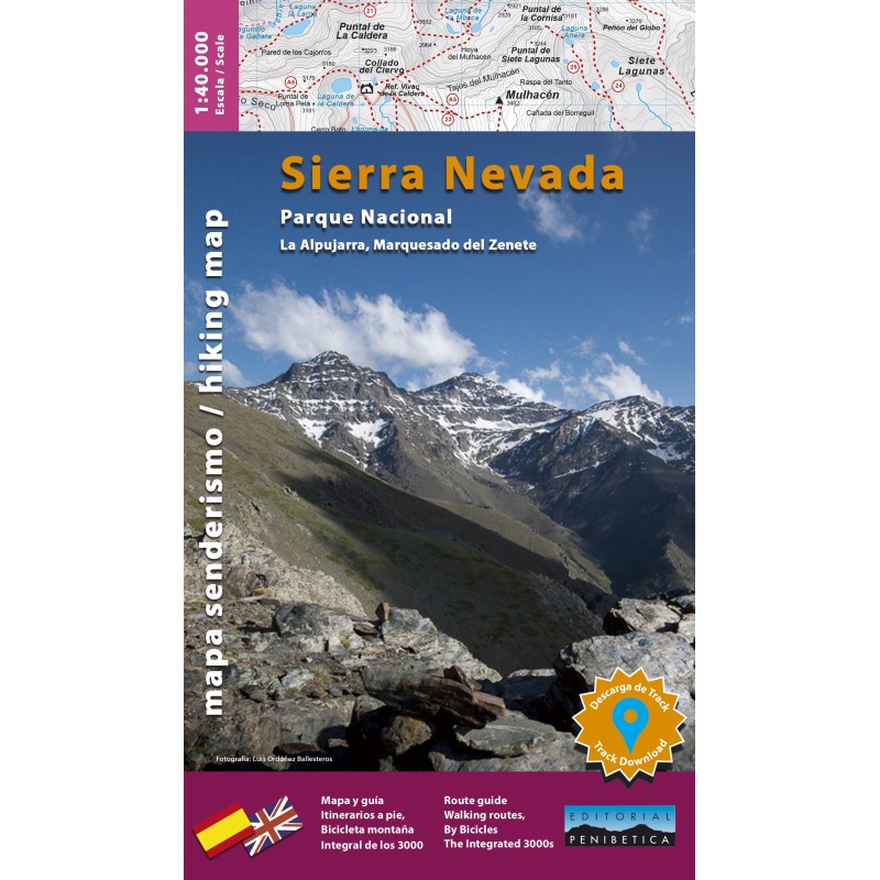Mapa y guía excursionista del Parque Nacional de Sierra Nevada (provincia de Granada) de escala 1:40.000. Incluye la Alpujarra y el Marquesado de Zenete. La guía que acompaña al mapa aporta información sobre ecología, geografía e historia de Sierra Nevada, y datos prácticos sobre refugios, vivacs, campings y teléfonos de interés. Incluye la descripción de un total de itinerarios a pie, la integral de los 3.000, el GR7, el Gr-Sulayr, la Transnevada, se pueden descargar track de itinerario con código QR.